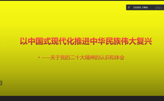 王老师以“以中国式现代化推进中华民族伟大复兴 关于党的二十大精神的认识和体会”为主题为大家详细解析了党的二十大报告。王老师将党的二十大报告分为三部分,全面清晰的总结了过去五年的主要工作和新时代十年的伟大变革,让我们明白了要治理好我们的大党、大国,保证党的团结和集中统一至关重要,维护党中央权威至关重要。