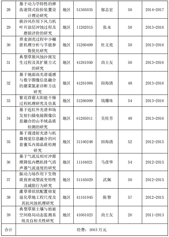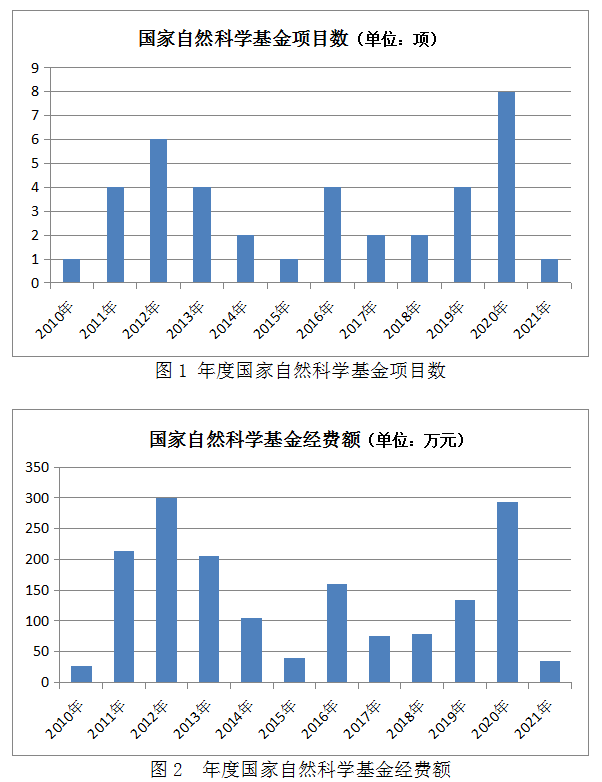 2010年至2021年,公司获批国家自然科学基金项目39项,其中面上项目1项、地区基金35项、青年基金3项,经费共计1663万元。年度申请项目数和经费如图1、图2所示。项目汇总信息详见表1。