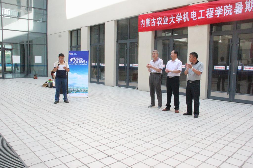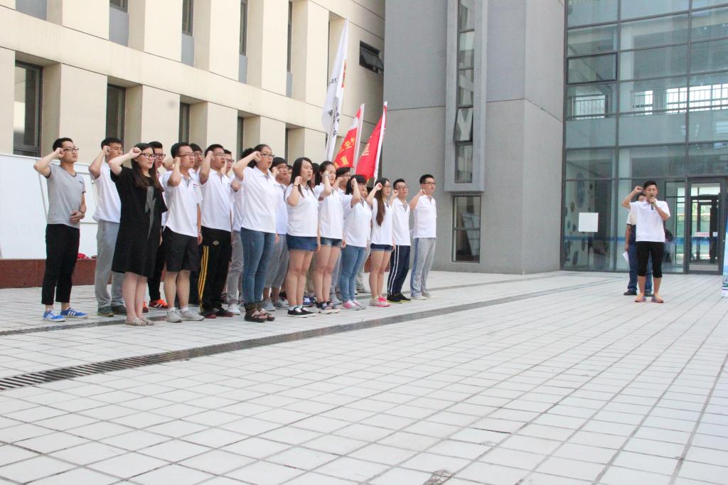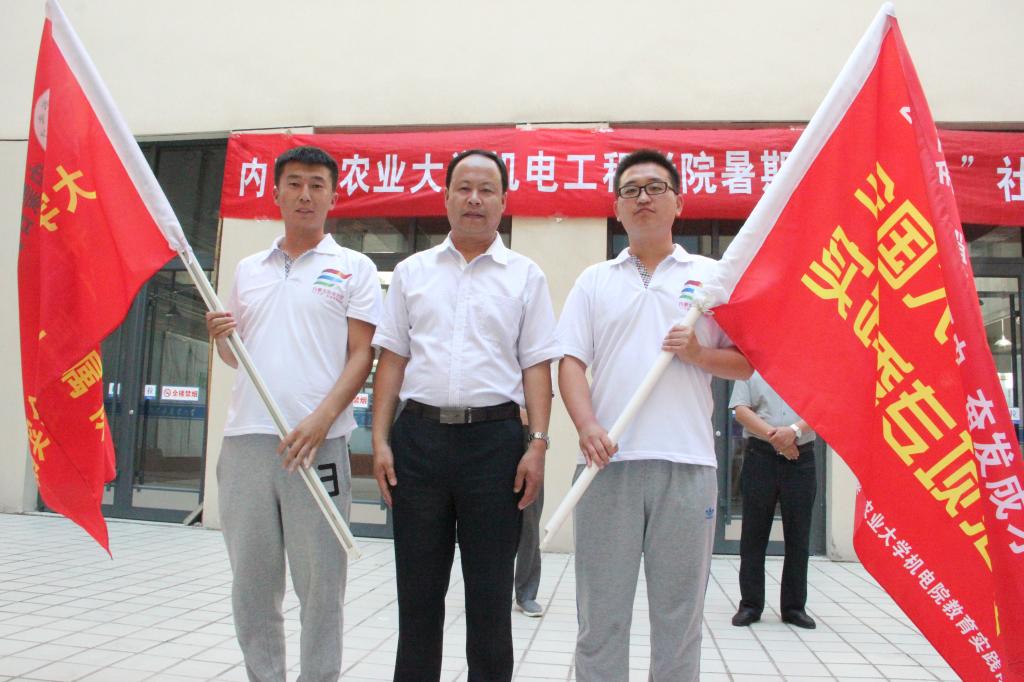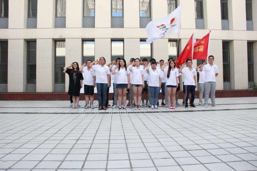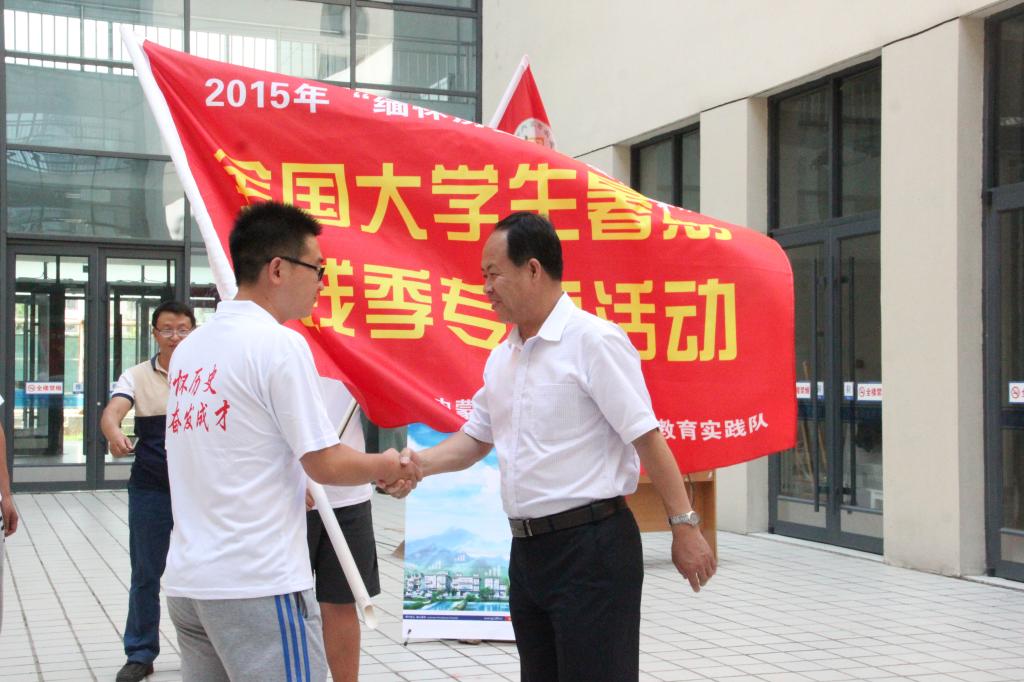 全体肃静奏唱国歌后,葛飞老师简要介绍了两支实践队的行程,第一支队伍将于7月20日——7月26日赴延安完成以“缅怀历史,奋发成才”为主题的全国老员工纪念抗战胜利70周年寻访活动,队员们通过实践调研在缅怀先烈中触碰信仰、在角色体验中传承价值,以实际行动推进“四进四信”活动效果。第二支队伍将于7月27日——7月31日赴和林格尔县参加2015年中国电信老员工暑期社会实践活动,围绕互联网+面向乡镇、农村进行乡镇信息化调研和推广应用。院分团委副书记张磊同学代表实践队员发言,院员工会主席陈杰带领全体实践队员庄严宣誓。那森巴雅尔同志对实践队员提出三点希望:第一在社会实践中求知,在实践中磨练意志、锻炼自我;第二要艰苦奋斗,团结协作,认真完成社会实践赋予的任务;第三注意安全,听从安排,在服务社会中彰显人生价值,在社会实践和向群众学习中增长才干。最后公司党委宣传部王中东部长为两支直属队授旗。