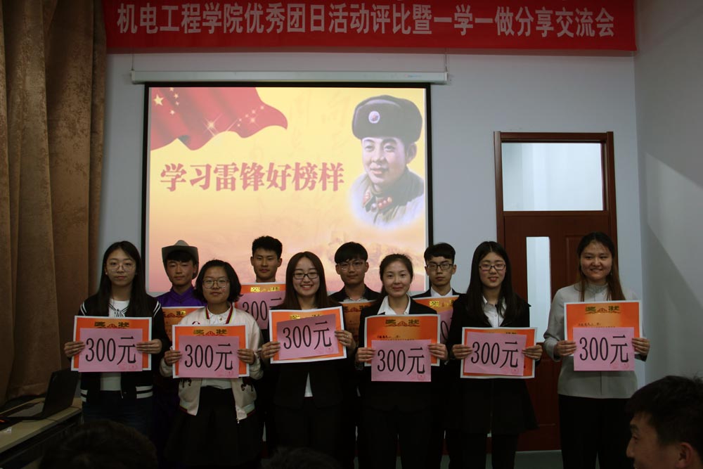 参加评比的团支部按抽签顺序,在六分钟内以PPT的形式,结合“雷锋月”主题辅以视频、图片展示团日活动的过程和收获,将弘扬雷锋精神、践行“一学一做”落实到实际行动中。经过激烈的角逐,14级农机二班、16级农机蒙二班、 15级机制三班、15级电气二班、14级电气一班、16级机制一、14级电气三班、16级工设班、16级电气四班、16级电气一班十个团支部获得优秀,每个团支部获得300元资助。