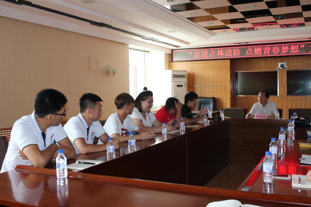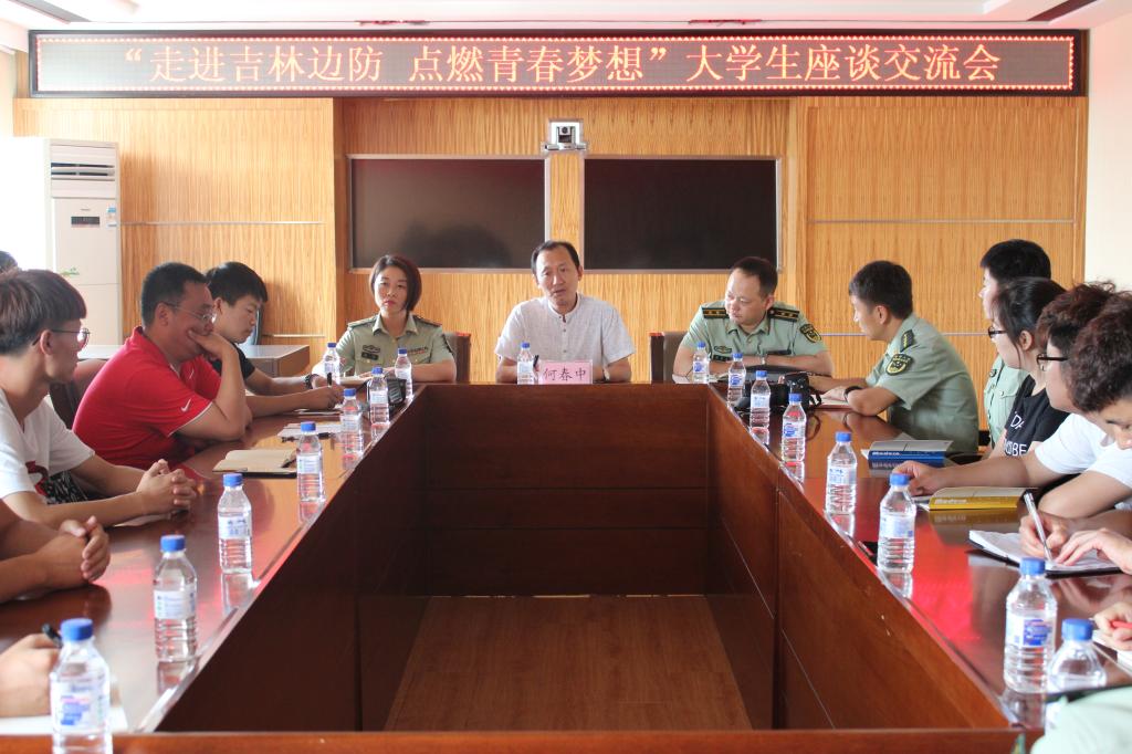 上午9:00于总队训练基地五楼会议室举行“走进吉林边防 点燃青春梦想”老员工座谈交流会,与会人员有中国青年报主编何春中、部队官兵和来自五所高校实践队的带队老师和员工代表,公司领队毕力格图老师从军营与大公司园的区别,从军改聊到高校思想政治工作,公司员工代表张翼强同学讲述了他在实践活动中的所思所感,表达了对部队的感谢,当提到这次活动的收获,他说道,这次实践活动更加坚定了他的理想信念,使他的人生目标变得更加清晰。
