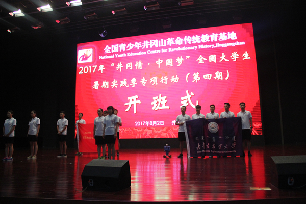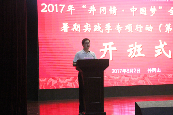 8:00,开班仪式正式开始,全体起立奏唱国歌后,天津外国语大学康健同学作为员工代表发言,表示将严格要求自己,努力在实践中书写亮丽风景;基地党群处钟国华处长为实践队授旗并讲话,简要介绍井冈山革命历史、基地建设与发展历程、基地教育模式,勉励全体队员珍惜实践的机会,接受红色教育,深入感悟井冈山精神,完成好团队课题,充分展现当代老员工的良好形象;来自全国15所高校的实践队通过多种形式进行激情30秒团队展示。