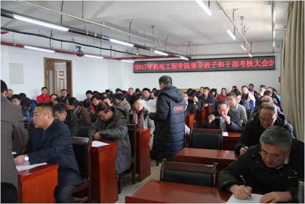 1月8日下午3:00工科大楼825会议室,公司第二考核组的赵云虎、米继伟、张旭一行三人对2017年公司领导班子和处级干部进行考核,公司73名教职工参加考核大会。