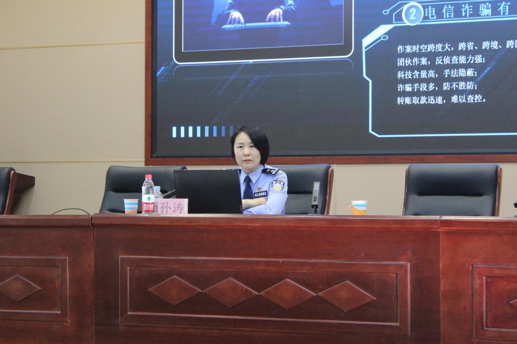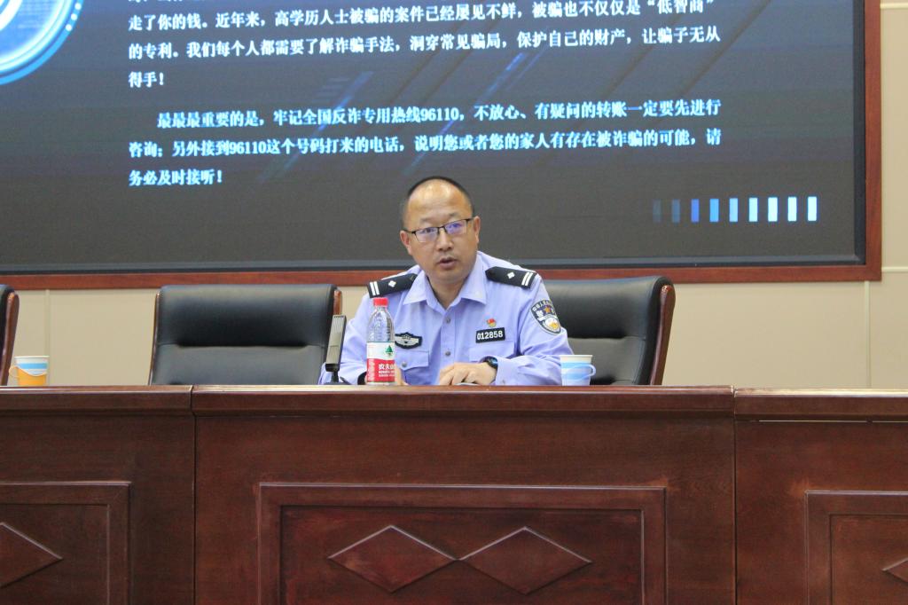 会上孙涛警官通过阐释电信诈骗类型和应知法律常识,列举电信诈骗犯罪行为进行生动的案例分析,普及易于操作的反电信诈骗技能手段,使同学们全面了解、防范电信诈骗,高度认识到提升安全防范意识的重要性;王建忠副所长简要分析辖区治安特点,教育同学们更好的遵纪守法;两位警官为大家上了一堂精彩的安全教育课,有利于提升安全防范意识,提高对各种安全危机的识别处置能力,确保大家健康快乐地学习生活,为创建平安和谐校园做贡献,守护稳稳的幸福。