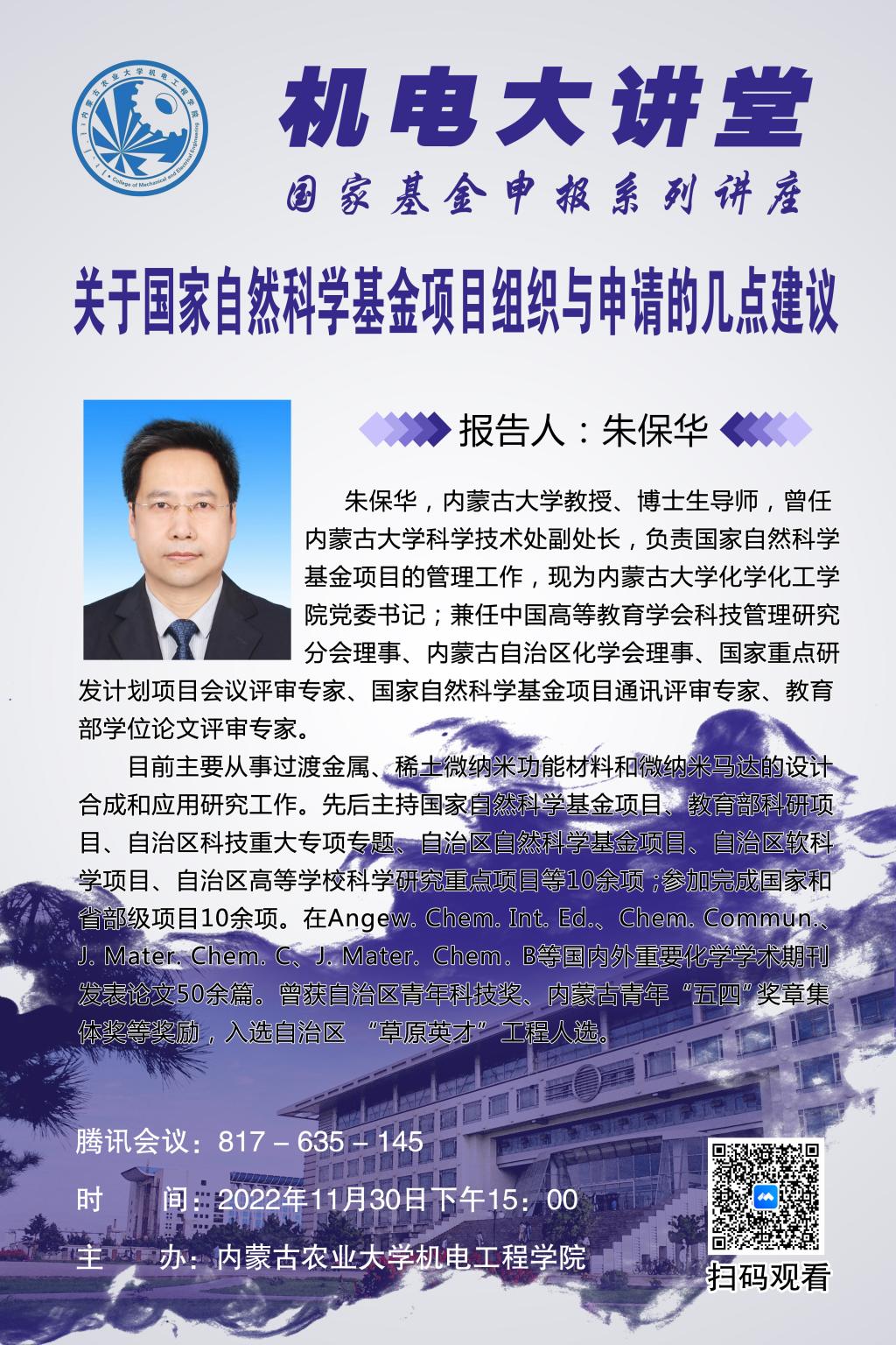 朱保华,内蒙古大学教授、博士生导师,曾任内蒙古大学科学技术处副处长,负责国家自然科学基金项目的管理工作,现为内蒙古大学化学化工公司党委书记;兼任中国高等教育学会科技管理研究分会理事、内蒙古自治区化学会理事、国家重点研发计划项目会议评审专家、国家自然科学基金项目通讯评审专家、教育部学位论文评审专家。