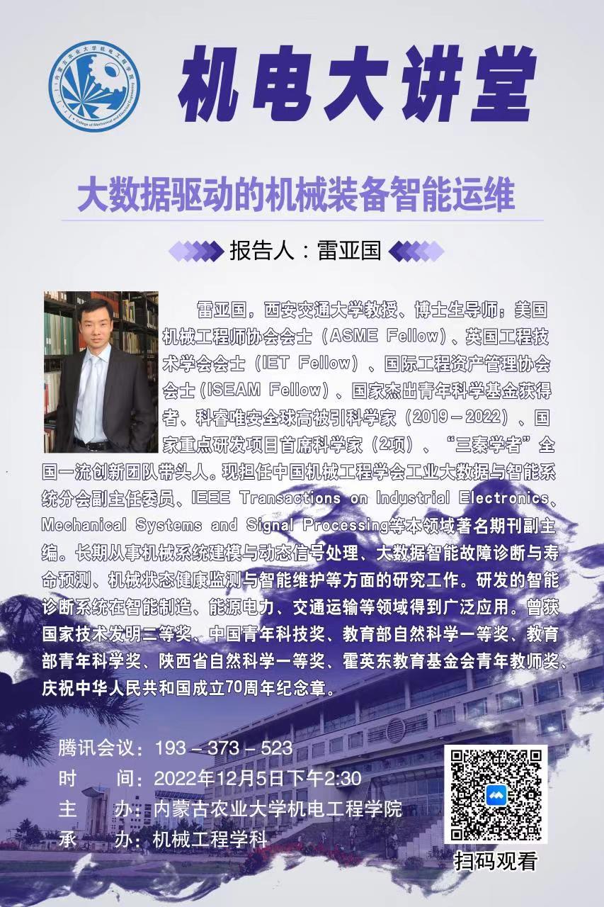 雷亚国,西安交通大学教授、博士生导师;美国机械工程师协会会士(ASME Fellow)、英国工程技术学会会士(IET Fellow)、国际工程资产管理协会会士(ISEAM Fellow)、国家杰出青年科学基金获得者、科睿唯安全球高被引科学家(2019-2022)、国家重点研发项目首席科学家(2项)、“三秦学者”全国一流创新团队带头人。现担任中国机械工程学会工业大数据与智能系统分会副主任委员、IEEE Transactions on Industrial Electronics、Mechanical Systems and Signal Processing等本领域著名期刊副主编。长期从事机械系统建模与动态信号处理、大数据智能故障诊断与寿命预测、机械状态健康监测与智能维护等方面的研究工作。研发的智能诊断系统在智能制造、能源电力、交通运输等领域得到广泛应用。曾获国家技术发明二等奖、中国青年科技奖、教育部自然科学一等奖、教育部青年科学奖、陕西省自然科学一等奖、霍英东教育基金会青年教师奖、庆祝中华人民共和国成立70周年纪念章。
