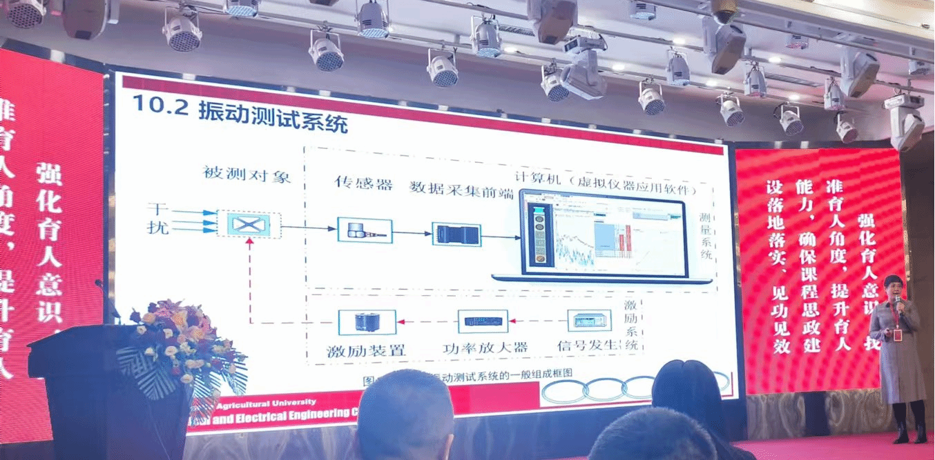 崔红梅教授展示的内容为《现代测试技术》第十章振动的测量。通过展示新疆石河子大学陈学庚院士团队研发的残膜回收机农田现场回收残膜实况,引出该项成果的工程价值及当前存在的问题—振动噪声大,引出所讲授内容—振动测试,继而导入工程案例,设置情境,基于情境导入、问题驱动和基于测试过程的案例教学设计,将知识与“大国重器”“工匠精神”等思政点有机融合,最后,面向标杆,针对工程问题及其解决方案展开讨论,迁移延伸,举一反三。