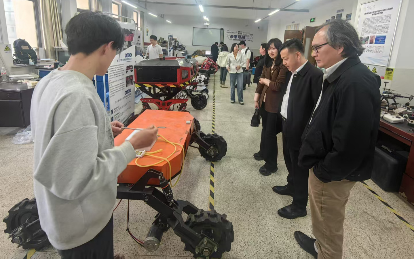 刘飞副经理作建设成效报告。围绕管理与运行机制、教学与人才培养、教学改革与研究、教学条件保障、教学团队建设、示范引领成效、特色亮点与创新等,系统阐述了公司实验教学中心自建设以来的整体成效。随后专家组进行针对性提问评价。汇报结束,专家组深入本科教学实验室,走访了公司电气控制实验室、机器人创新实验室、机械制造创新实验室及方程式车队。专家组高度评价公司实验教学中心“以员工发展为核心”的建设理念和显著成效,同时对进一步深化产教融合、员工创新等提出了宝贵建议。