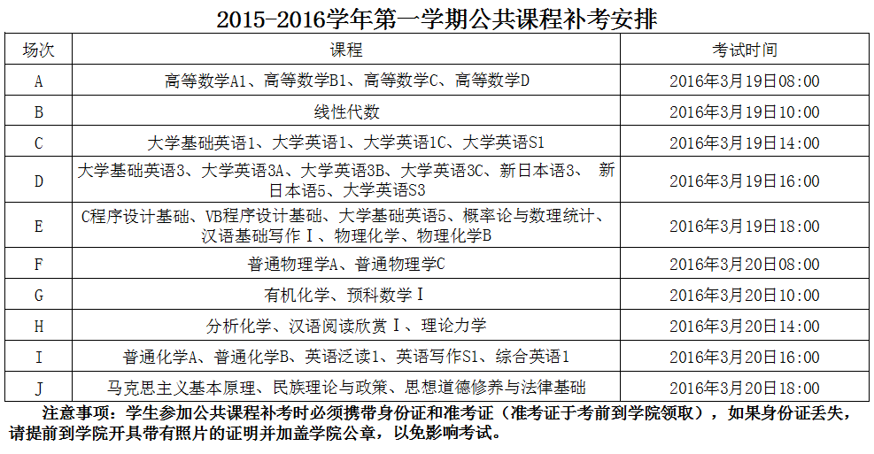 2015-2016学年第一学期公共课补考在3月19日—20日进行(具体安排见下表),请有补考的同学,在本周三(3月16日)下午下班前来bevictor伟德315取准考证。