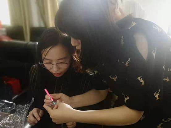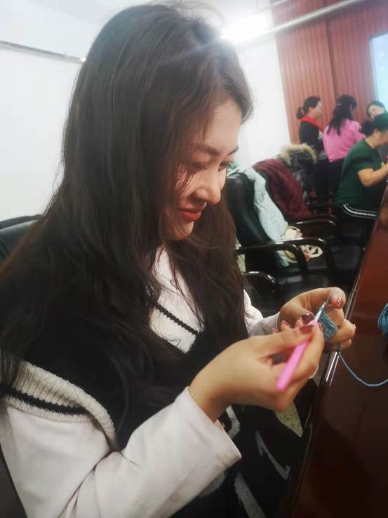 小小的钩针在指导老师的手里飞针走线、运用自如,但对于没接受过这种工作训练的女教师们来说简直是织针难下。但是在老师的耐心指导下,在女老师们不懈的挑战下,历经2个小时,终于完成了满意的针织作品。