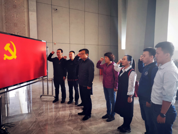 纪念馆内,大家面对鲜红的党旗,庄严宣誓,“对党忠诚,积极工作,为共产主义奋斗终身”。