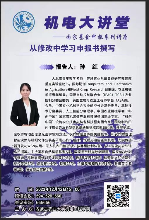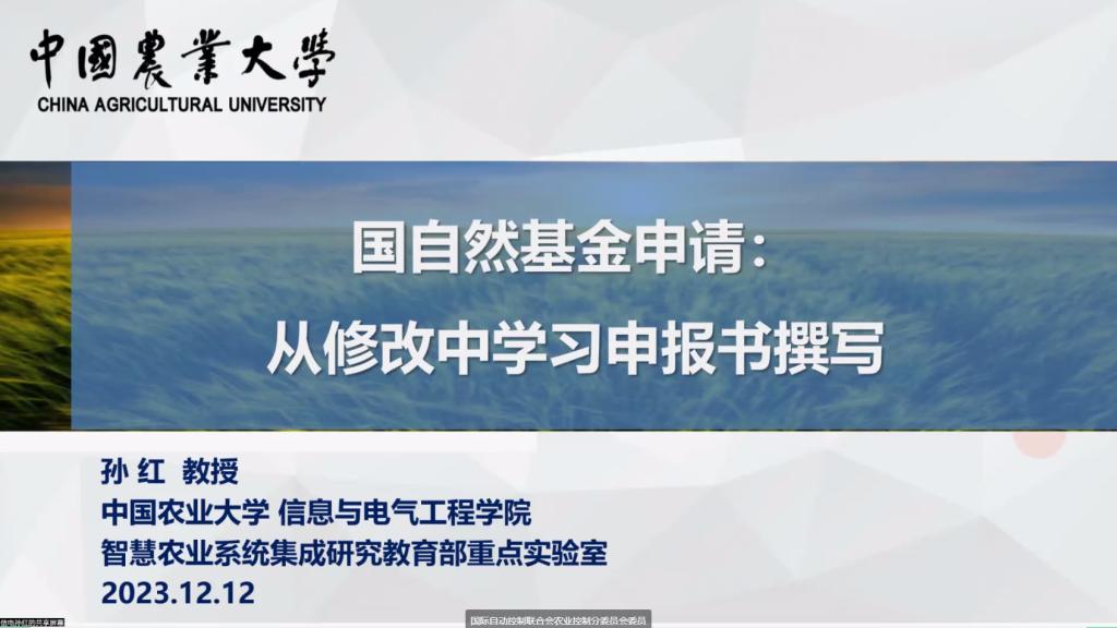 推动公司教师做好2024度国自然基金申报工作,进一步提升国家自然科学基金项目质量,公司于20231212日下午300,特邀中国农业大学信息与电气工程公司孙红教授,通过线上的形式开展了题为“从修改中学习申报书撰写”的学术报告。报告由公司党委屈丰富书记主持,科技处阿荣副处长出席了报告会,公司部分教师和研究生参加了会议。