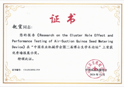 公司多名研究生参加了论坛活动。在田间农业机械装备分论坛,博士研究生董文学以“藜麦精量排种器关键技术研究”为题进行报告;在农业生物环境与能源工程、植保技术与装备分论坛,博士研究生靳霄微以“秸秆-薯渣致密成型条件及机理研究”为题进行报告。
